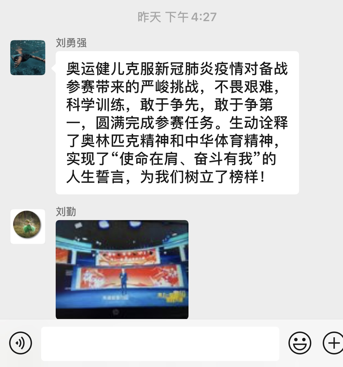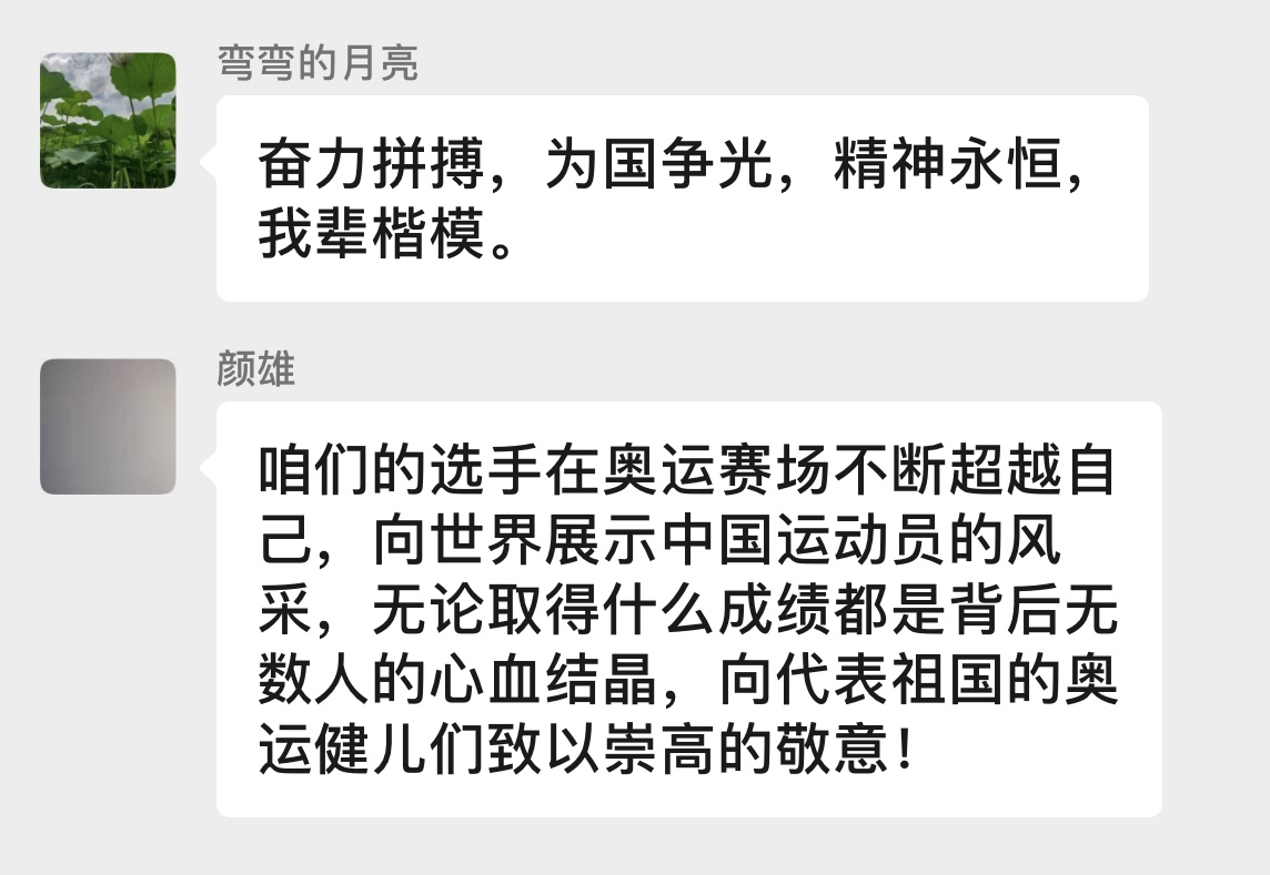思政课教师刘勇强:奥运健儿克服新冠肺炎疫情对备战参赛带来的严峻挑战,不畏艰难,科学训练,敢于争先,敢于争第一,圆满完成参赛任务,生动诠释了奥林匹克精神和中华体育精神,实现了“使命在肩、奋斗有我”的人生誓言,为我们树立了榜样!