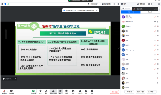 为有效提升教师教学能力,切实讲好“思想道德与法治”课程,落实立德树人根本任务,2023年8月23日下午,公司开展线上集体备课活动,德法教研室主任易云主持会议,公司全体思政课教师参加会议。本次集体备课会主要有备课展示、集体研讨、计划总结三个环节。