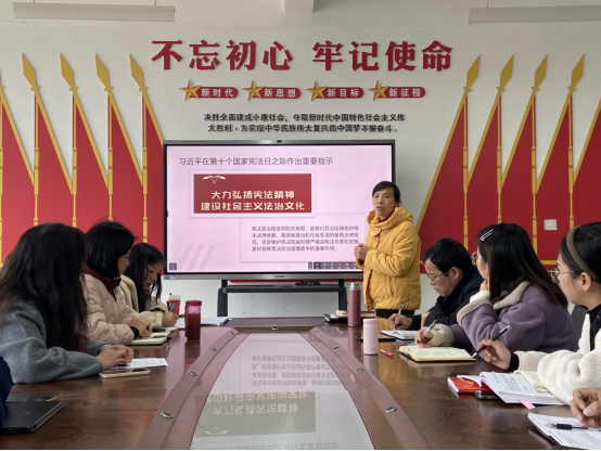 会上,《思想道德与法治》课程负责人易云领学了《习近平著作选读》第一卷第三十六篇“对首个国家宪法日作出的指示”内容。