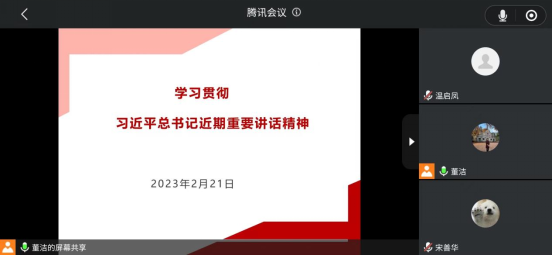 2023年2月21日下午,SUNBET申博党支部召开党员大会,集中学习习近平总书记近期重要讲话精神。会议以线上方式进行,SUNBET申博党支部副书记董洁主持会议,全体党员教师参加会议。