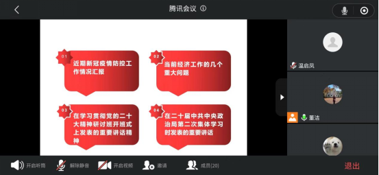 会议主要学习了“习近平总书记在中央政治局常委会听取近期新冠疫情防控工作情况汇报时的重要讲话精神、习近平总书记在学习贯彻党的二十大精神研讨班开班式上的重要讲话精神和《求是》杂志发表的习近平总书记重要文章《当前经济工作的几个重大问题》”等内容。
