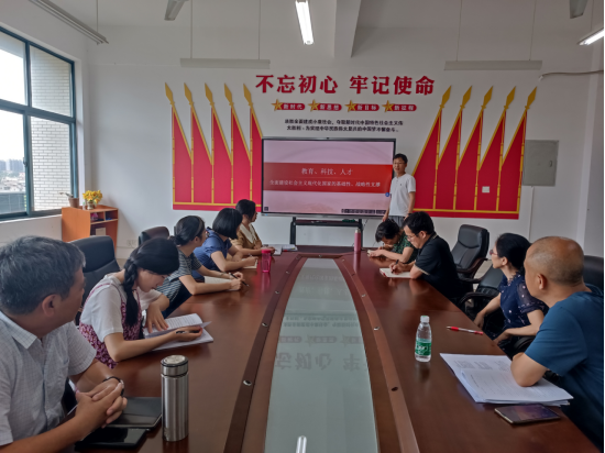 2023年7月7日下午,SUNBET申博召开理论学习中心组(扩大)学习会议,专题学习习近平总书记在中共中央政治局第五次集体学习时的重要讲话精神。党支部委员王卓以“教育、科技、人才是全面建设社会主义现代化国家的基础性、战略性支撑”为题作专题党课,党员刘勤、颜雄、彭红彬进行交流发言。