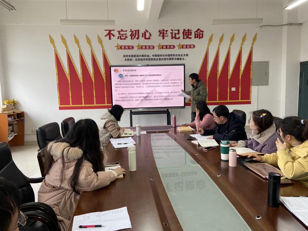会上,李莹、彭红彬分别领学两篇文章,王卓以微党课的形式讲授了人民代表大会制度、人民政协的形成历史及伟大实践。全体党员在李莹、吴志军的带领下重温了《习近平著作选读》第二卷里的相关内容。随后各支部委员进行了学习交流。
